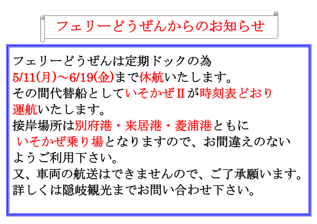 下記期間について、フェリーどうぜんの定期ドックに伴う休航の発表がございました。